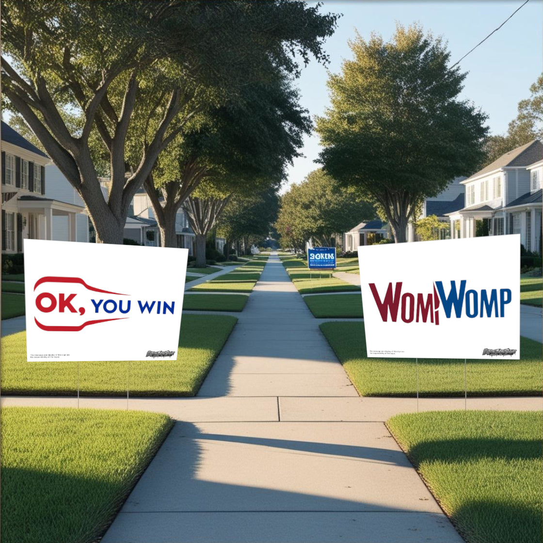 When the circus is in town and all you can do is sigh, the "Womp Womp" yard sign sums it up perfectly. A visual groan disguised as clever typography, it’s a cheeky nod to disappointment fatigue—ideal for anyone who’s seen enough to just go full sound effect. Other sign sold separately.